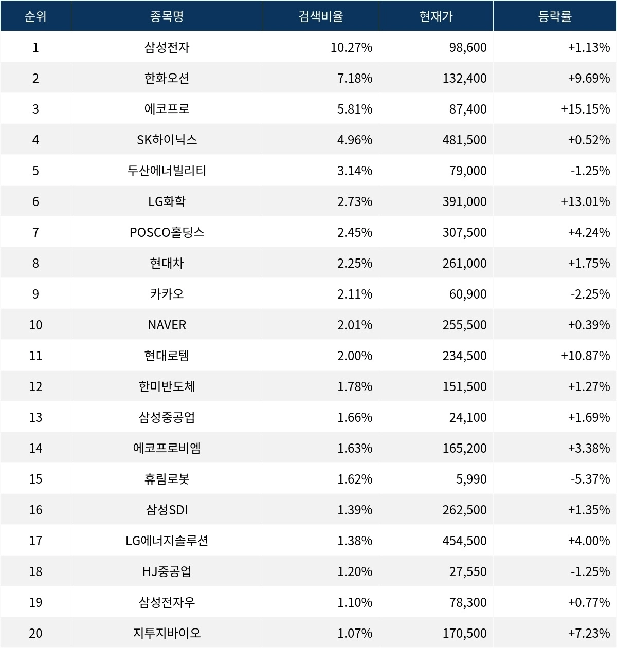 6위 LG화학(051910)은 등락률 13.01%로 급등세를 기록했다. 7위 POSCO홀딩스(005490)는 4.24%의 상승세로 거래를 마쳤다. 8위 현대차(005380)는 1.75% 상승했다. 9위 카카오(035720)는 -2.25%의 등락률로 주가가 소폭 하락했다. 10위 NAVER(035420)는 0.39%로 보합세를 보였다.