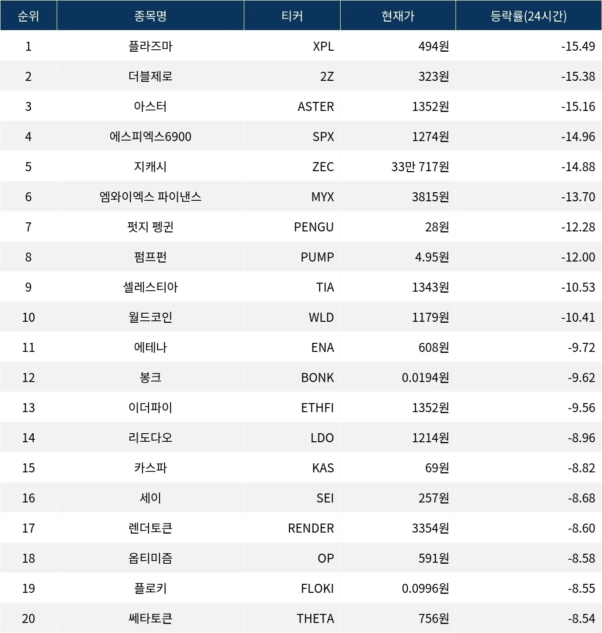 [서울데이터랩]플라즈마 더블제로 아스터 24시간 하락률 상위