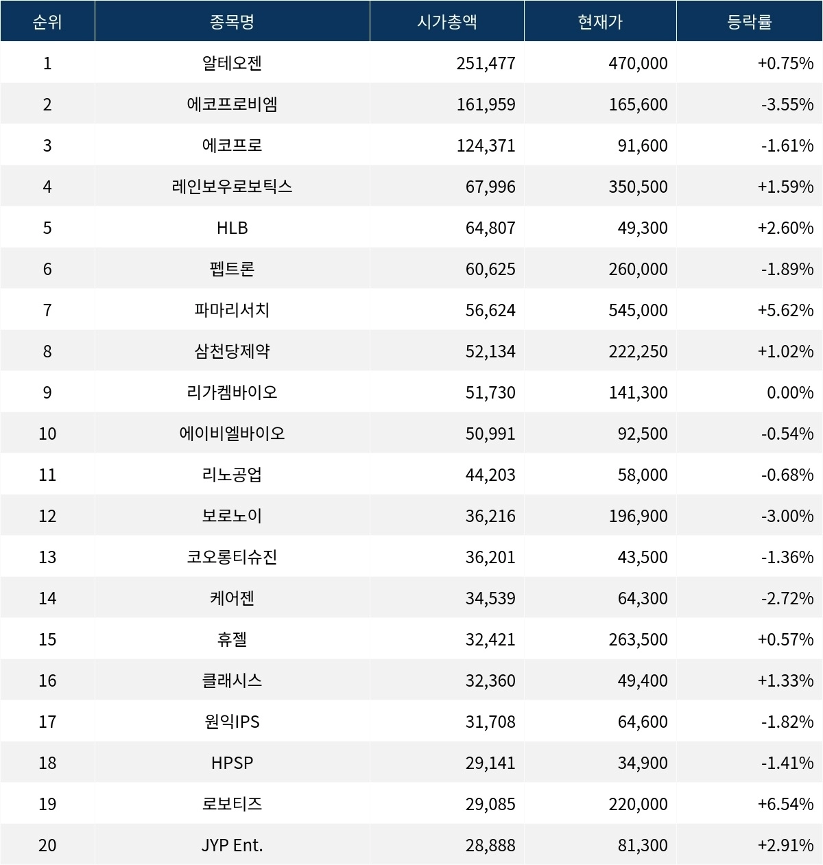 시가총액 3위 에코프로(086520)는 91,600원으로 1.61% 하락하고 있으며, 레인보우로보틱스(277810)는 1.59% 상승한 350,500원이다. HLB(028300)는 49,300원으로 2.60% 상승, 펩트론(087010)은 260,000원으로 1.89% 하락, 파마리서치(214450)는 545,000원으로 5.62% 상승하고 있다. 삼천당제약(000250)은 222,250원으로 1.02% 상승, 리가켐바이오(141080)는 141,300원으로 보합세를 유지하고 있으며, 에이비엘바이오(298380)는 92,500원으로 0.54% 하락하고 있다.