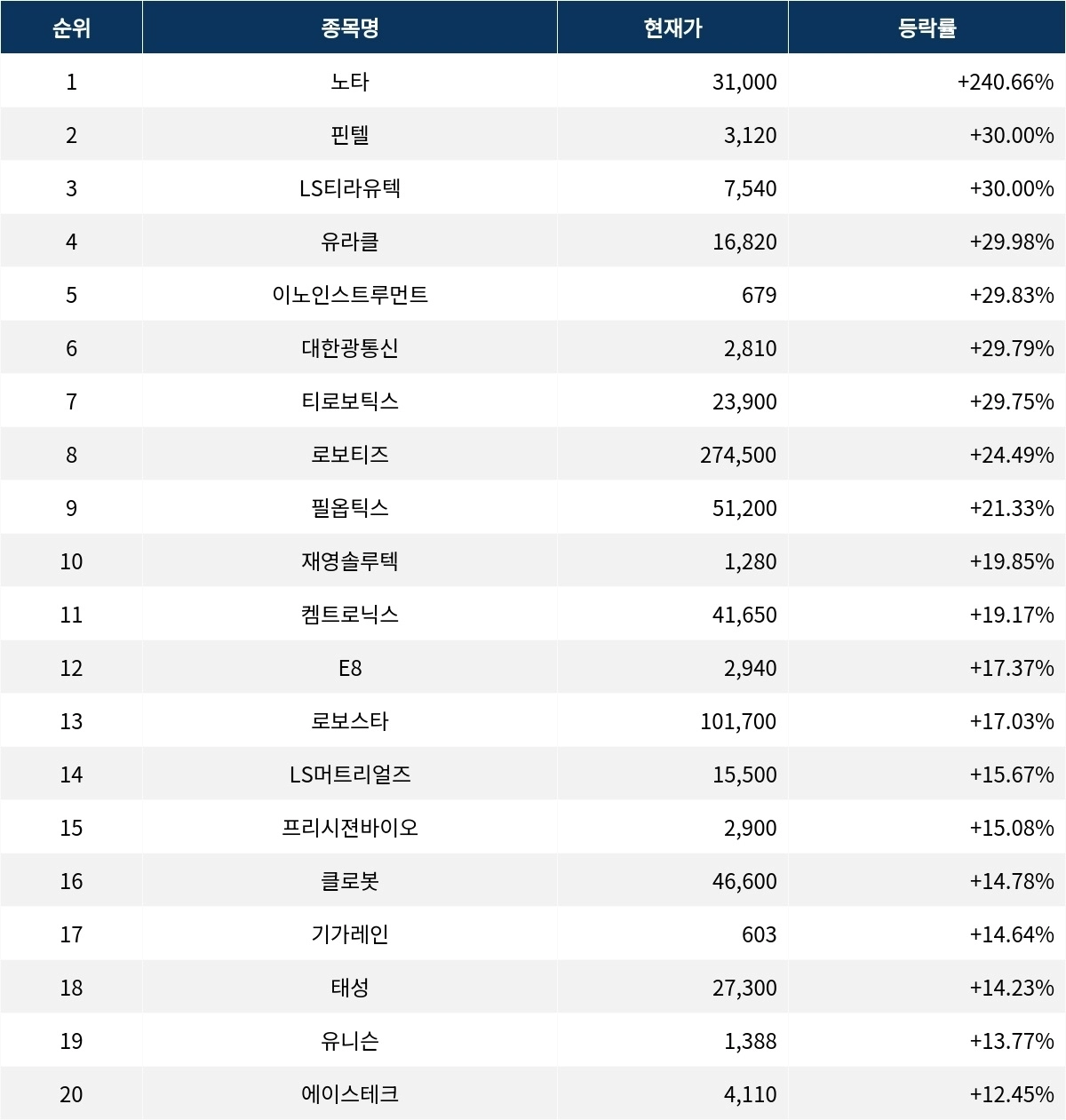 6위 대한광통신(010170)은 종가 2,810원으로 +29.79% 상승 마감했다. 7위 티로보틱스(117730)는 종가 23,900원으로 +29.75% 상승 마감했다. 8위 로보티즈(108490)는 종가 274,500원으로 +24.49% 상승 마감했다. 9위 필옵틱스(161580)는 종가 51,200원으로 +21.33% 상승 마감했다. 10위 재영솔루텍(049630)은 종가 1,280원으로 +19.85% 상승 마감했다.