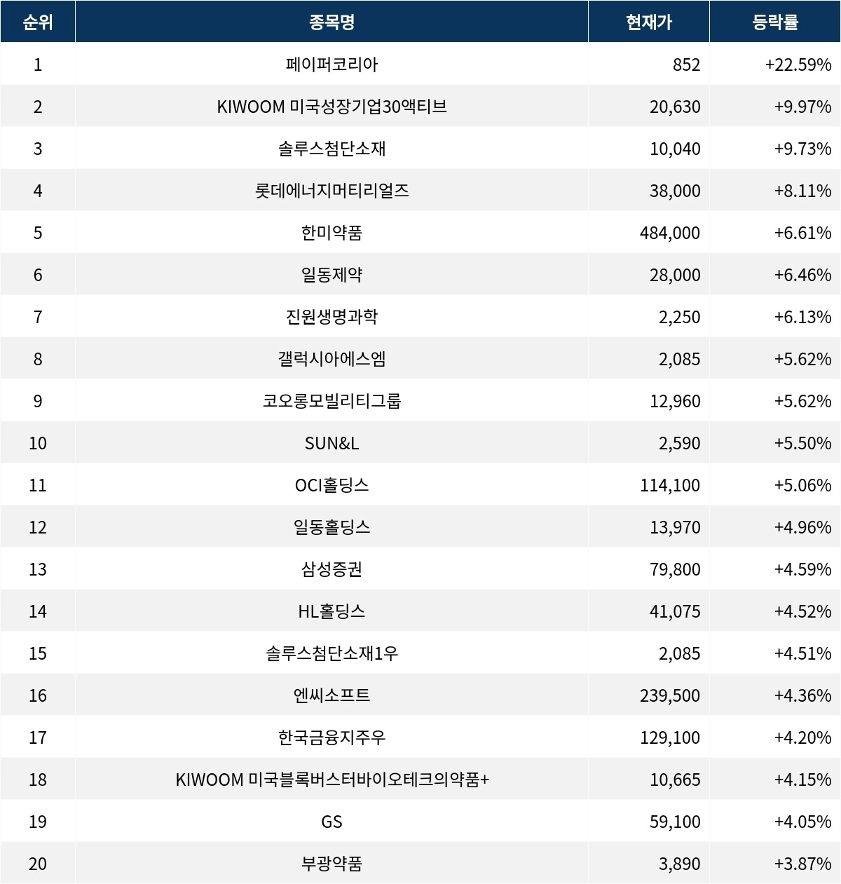 [서울데이터랩]‘페이퍼코리아’ 22.59% 폭등…실시간 상승률 1위