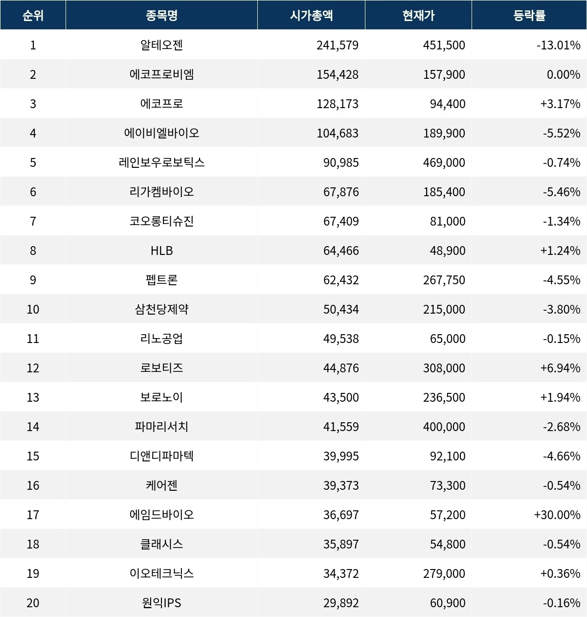 시가총액 상위 종목들은 전반적으로 혼조세를 보이고 있으며, 알테오젠과 에임드바이오가 각각 급락세와 상한가를 기록하여 눈길을 끌고 있다. 거래량이 많은 종목으로는 알테오젠과 에코프로가 있으며, PER와 ROE 지표에서는 알테오젠이 상대적으로 높은 수치를 보이고 있다.