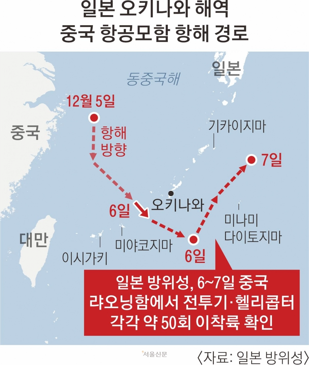 중국 군용기의 자위대 전투기 레이더 조준을 둘러싸고 중일 간 책임 공방이 가열된 가운데 중국 항공모함 ‘랴오닝’의 대규모 함재기 이착륙까지 잇따르며 양국 갈등이 군사 대립으로 빠르게 옮겨가고 있다. 8일 NHK 등에 따르면 중국 항공모함 랴오닝함은 지난 6~7일 오키나와 본섬과 미나미다이토지마 사이 해역에서 함재기와 헬리콥터의 이착륙을 약 100회 실시했다. 일본 방위성은 호위함을 동원한 경계·감시와 함께 항공자위대 전투기를 긴급 발진(스크램블)시키는 등 대응에 나섰다. 중국 항모 전투기가 다이토 제도 사이 해역에서 이착륙한 것이 공식 확인된 건 처음이다.