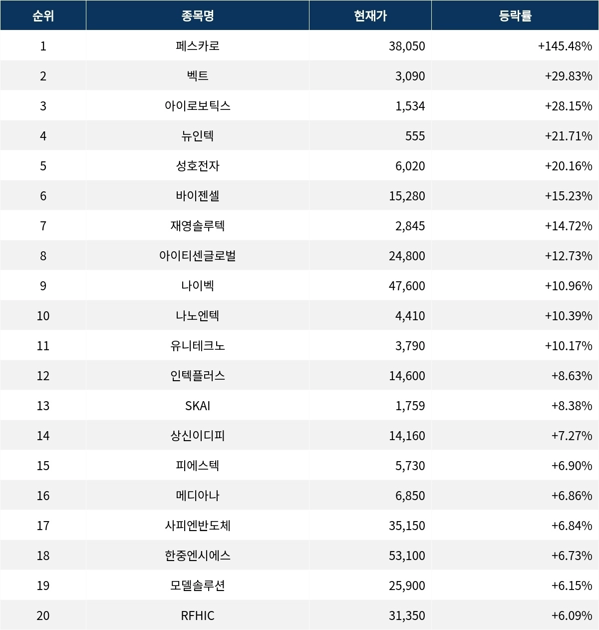 6위 바이젠셀(308080)은 현재가 15,280원으로 15.23% 급등 중이다. 7위 재영솔루텍(049630)은 현재가 2,845원으로 14.72% 급등 중이다. 8위 아이티센글로벌(124500)은 현재가 24,800원으로 12.73% 급등 중이다. 9위 나이벡(138610)은 현재가 47,600원으로 10.96% 상승 중이다. 10위 나노엔텍(039860)은 현재가 4,410원으로 10.39% 상승 중이다.
