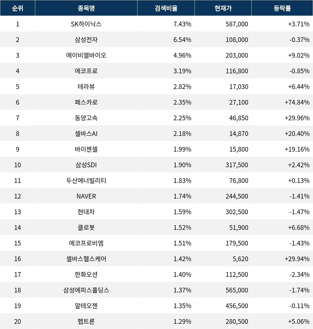 이어 검색비율 2위의 삼성전자(005930)는 등락률 -0.37%로 소폭 하락했다. 검색비율 3위의 에이비엘바이오(298380)는 9.02% 상승 마감했다. 검색비율 4위 에코프로(086520)는 -0.85% 하락했다. 검색비율 5위 테라뷰(950250)는 6.44% 상승하며 거래를 마쳤다.