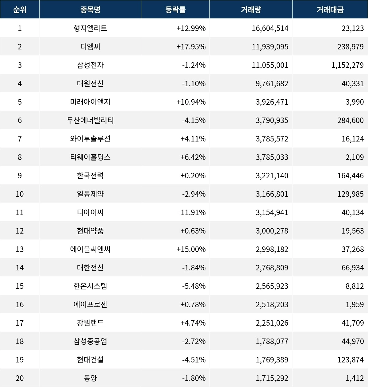 한편 거래량 상위 20위권 종목들은 디아이씨(092200) ▼11.91%, 현대약품(004310) ▲0.63%, 에이블씨엔씨(078520) ▲15.00%, 대한전선(001440) ▼1.84%, 한온시스템(018880) ▼5.48%, 에이프로젠(007460) ▲0.78%, 강원랜드(035250) ▲4.74%, 삼성중공업(010140) ▼2.72%, 현대건설(000720) ▼4.51%, 동양(001520) ▼1.80% 등의 성적을 기록했다.