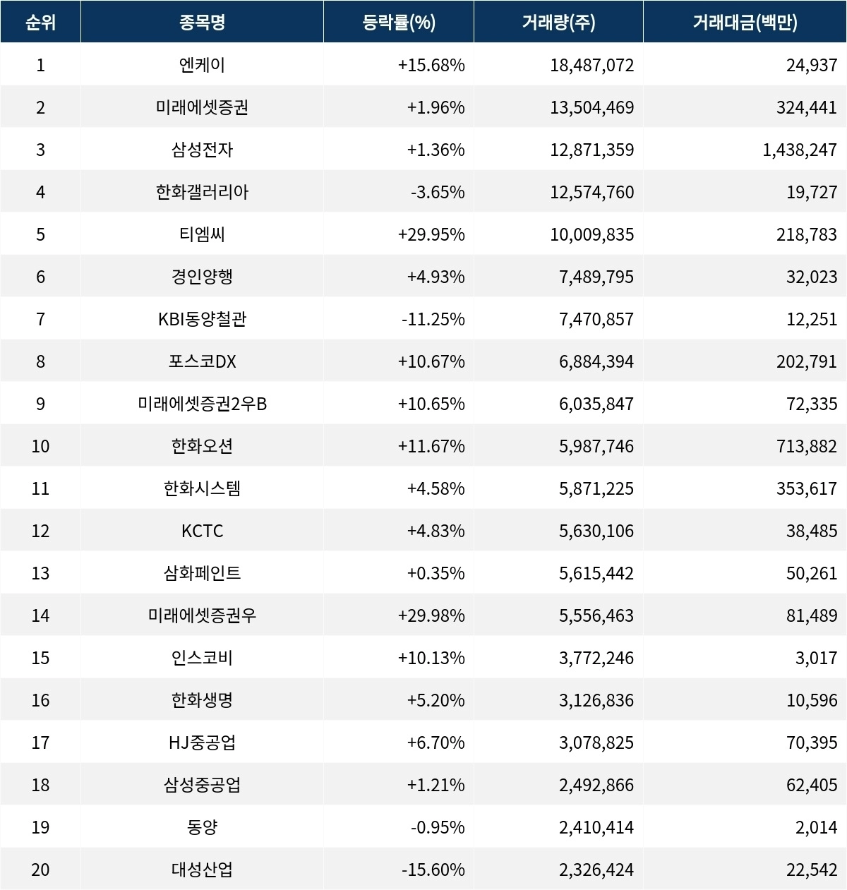 한편 거래량 상위 20위권 종목들은 한화시스템(272210) ▲4.58%, KCTC(009070) ▲4.83%, 삼화페인트(000390) ▲0.35%, 미래에셋증권우(006805) ▲29.98%, 인스코비(006490) ▲10.13%, 한화생명(088350) ▲5.20%, HJ중공업(097230) ▲6.70%, 삼성중공업(010140) ▲1.21%, 동양(001520) ▼0.95%, 대성산업(128820) ▼15.60% 등의 성적을 기록했다.