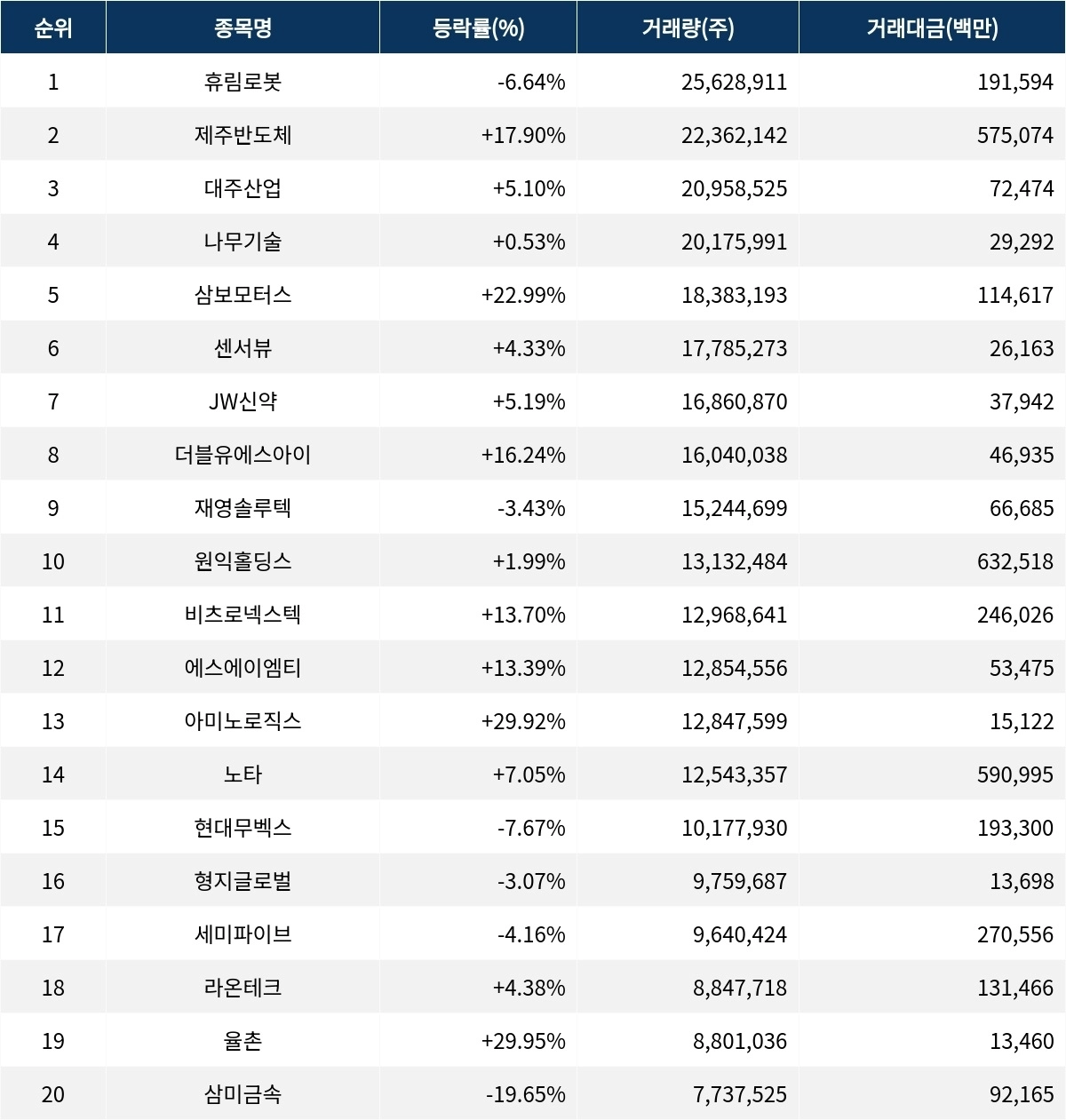 대주산업(003310)은 현재가 3400원, 등락률 5.10%, 거래량 2095만 8525주를 기록하고 있다. 나무기술(242040)은 현재가 1324원으로 보합세를 유지하며 거래량 2017만 5991주를 기록 중이다. 삼보모터스(053700)는 현재가 6420원에 22.99%의 폭등을 보이며 1838만 3193주의 거래량을 보이고 있다. 센서뷰(321370)는 1300원으로 4.33% 상승하며 거래량 1778만 5273주를 기록하고 있다. JW신약(067290)은 2130원으로 5.19% 상승하며 1686만 870주가 거래되고 있다. 더블유에스아이(299170)는 2935원으로 16.24% 상승하며 1604만 38주의 거래량을 나타내고 있다. 재영솔루텍(049630)은 4510원으로 3.43% 하락하며 1524만 4699주가 거래되고 있다. 원익홀딩스(030530)는 4만 8700원으로 1.99% 상승하며 1313만 2484주의 거래량을 기록하고 있다.