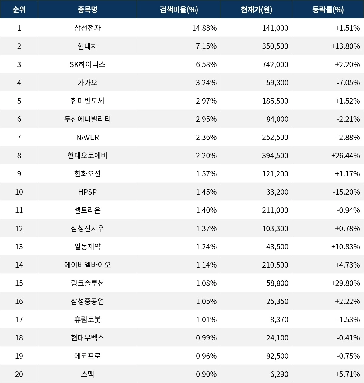 이어 검색비율 2위의 현대차(005380)는 상승률 13.80%로 급등 마감했다. 검색비율 3위의 SK하이닉스(000660)는 2.20% 상승 마감했다. 검색비율 4위 카카오(035720)는 하락률 7.05%로 하락했다. 검색비율 5위 한미반도체(042700)는 1.52% 상승했다.