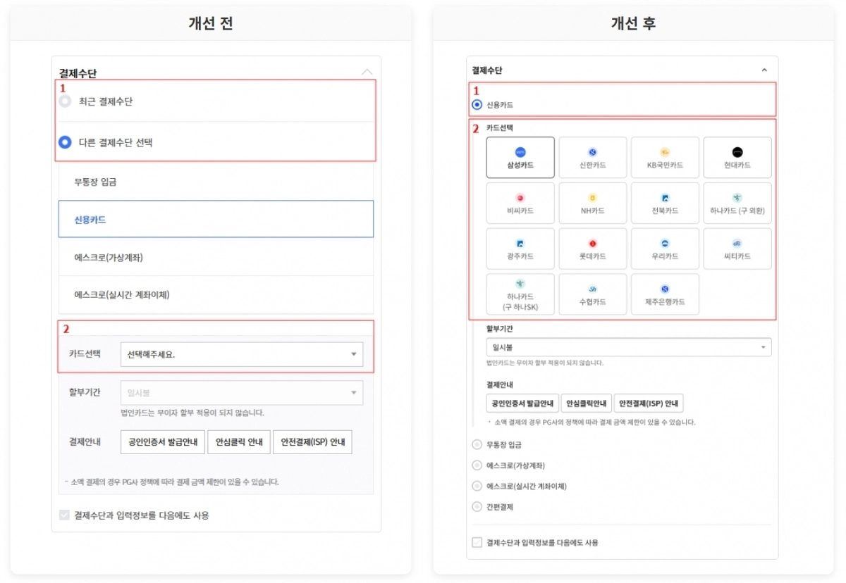 결제수단 선택 과정도 한층 직관적으로 개선했다. 기존의 ‘최근 결제수단’과 ‘다른 결제수단’으로 나뉘어 복잡했던 옵션을 정리하고, 최근 결제수단이 기본으로 선택되도록 했다. 신용카드 빠른결제 시에는 카드사 로고가 포함된 카드 형태의 UI를 적용해 고객이 한눈에 결제수단을 파악하고 선택할 수 있다.