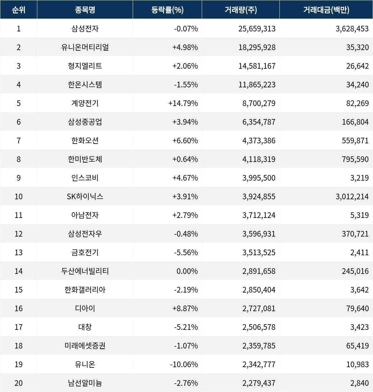 한편 거래량 상위 20위권 종목들은 아남전자(008700) ▲2.79%, 삼성전자우(005935) ▼0.48%, 금호전기(001210) ▼5.56%, 두산에너빌리티(034020) 보합, 한화갤러리아(452260) ▼2.19%, 디아이(003160) ▲8.87%, 대창(012800) ▼5.21%, 미래에셋증권(006800) ▼1.07%, 유니온(000910) ▼10.06%, 남선알미늄(008350) ▼2.76% 등의 성적을 기록했다.