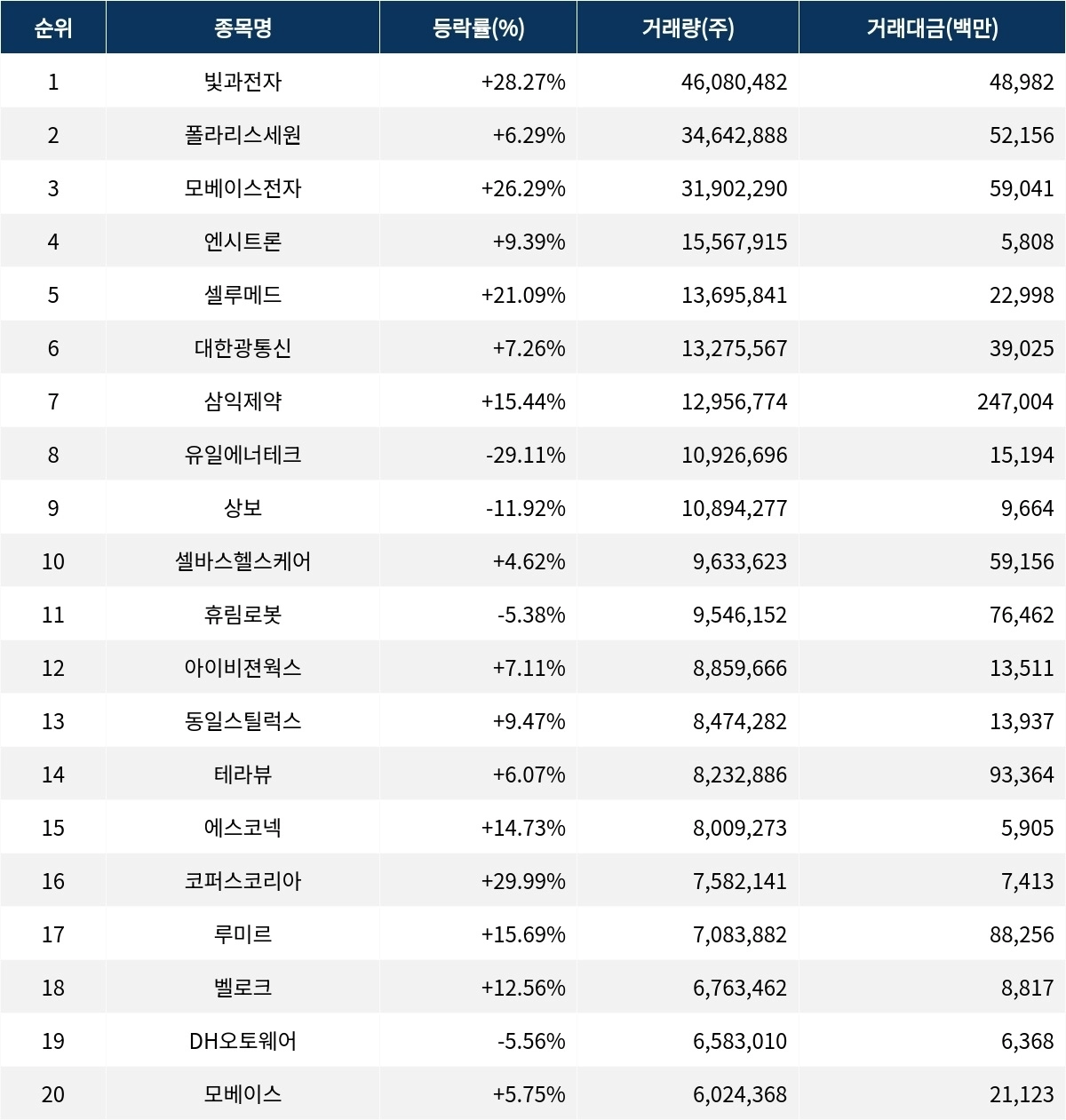 한편 거래량 상위 20위권 종목들은 휴림로봇(090710) ▼5.38%, 아이비젼웍스(469750) ▲7.11%, 동일스틸럭스(023790) ▲9.47%, 테라뷰(950250) ▲6.07%, 에스코넥(096630) ▲14.73%, 코퍼스코리아(322780) ▲29.99%, 루미르(474170) ▲15.69%, 벨로크(424760) ▲12.56%, DH오토웨어(025440) ▼5.56%, 모베이스(101330) ▲5.75% 등의 성적을 기록했다.