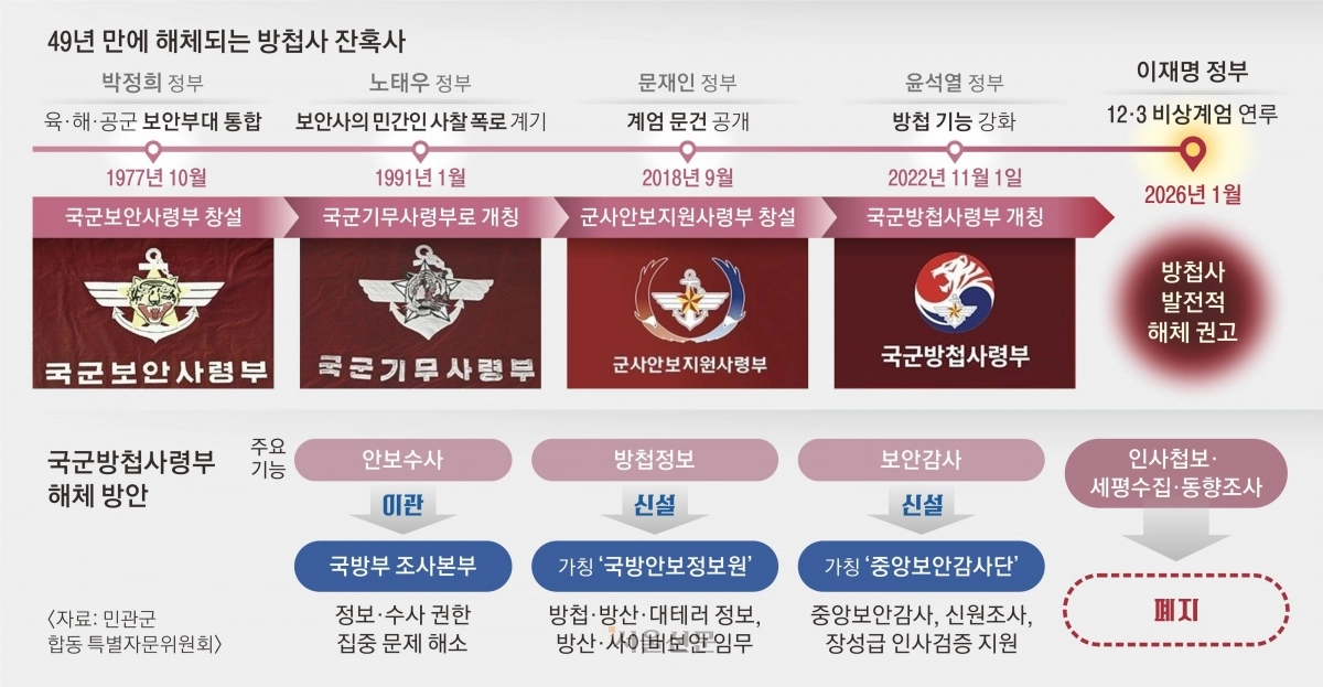 12·3 비상계엄 당시 ‘사전 모의’ 의혹과 함께 대규모 병력을 출동시켜 비상계엄 핵심 기관으로 지목된 국군방첩사령부(방첩사)가 해체된다. 정치적 논란의 한가운데 설 때마다 명칭을 바꾸면서도 핵심 기능을 유지하며 무소불위의 권한을 놓지 않았던 방첩사가 49년 만에 역사의 뒤안길로 사라지는 것이다.