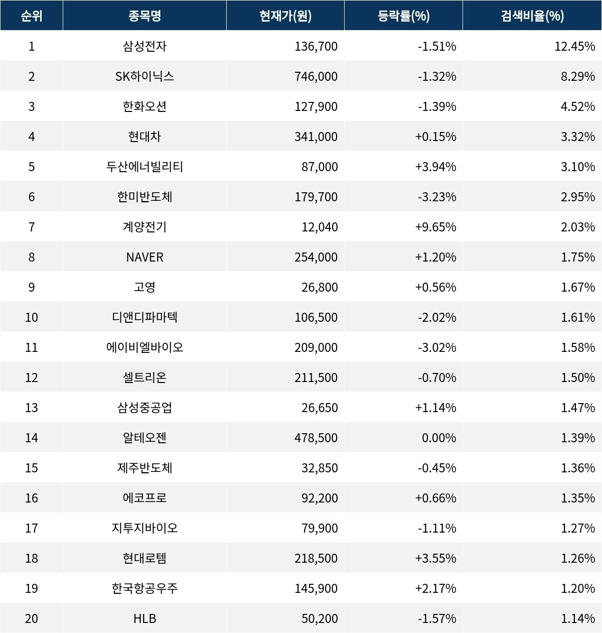 이 밖에도 두산에너빌리티 ▲3.94%, 한국항공우주(047810) ▲2.17%, 현대로템(064350) ▲3.55%, NAVER ▲1.20%, 고영 ▲0.56%, 삼성중공업(010140) ▲1.14%, 현대차 ▲0.15%, 알테오젠(196170) 0.00%, 에코프로(086520) ▲0.66%, 제주반도체(080220) ▼0.45% 등이 많이 검색되고 있다.