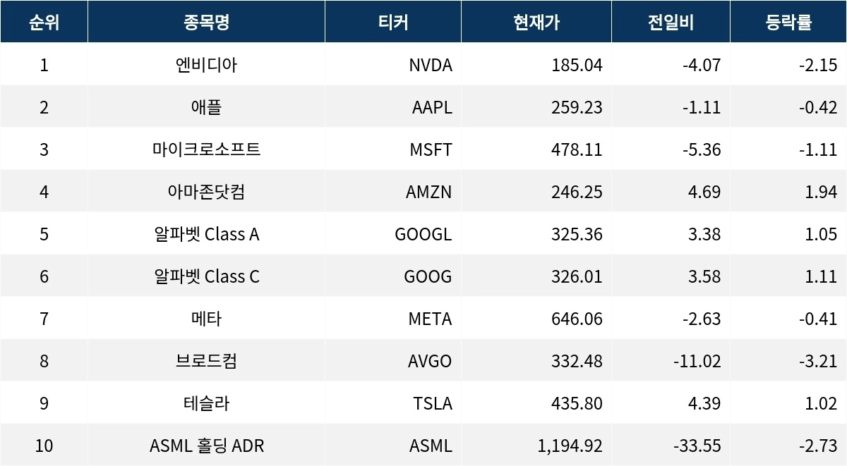 엔비디아(NVDA)는 -2.15% 하락하며 185.04 달러로 거래를 마쳤다. 애플(AAPL)은 -0.42% 하락하며 259.23 달러의 가격을 기록했다. 마이크로소프트(MSFT)는 -1.11% 하락한 478.11 달러로 마감했다.