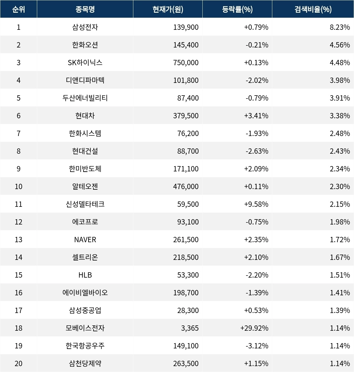 이 밖에도 신성델타테크(065350) ▲9.58%, NAVER(035420) ▲2.35%, 셀트리온(068270) ▲2.10%, HLB(028300) ▼2.20%, 에이비엘바이오(298380) ▼1.39%, 삼성중공업(010140) ▲0.53%, 모베이스전자(012860) ▲29.92%, 한국항공우주(047810) ▼3.12%, 삼천당제약(000250) ▲1.15% 등이 많이 검색되고 있다.