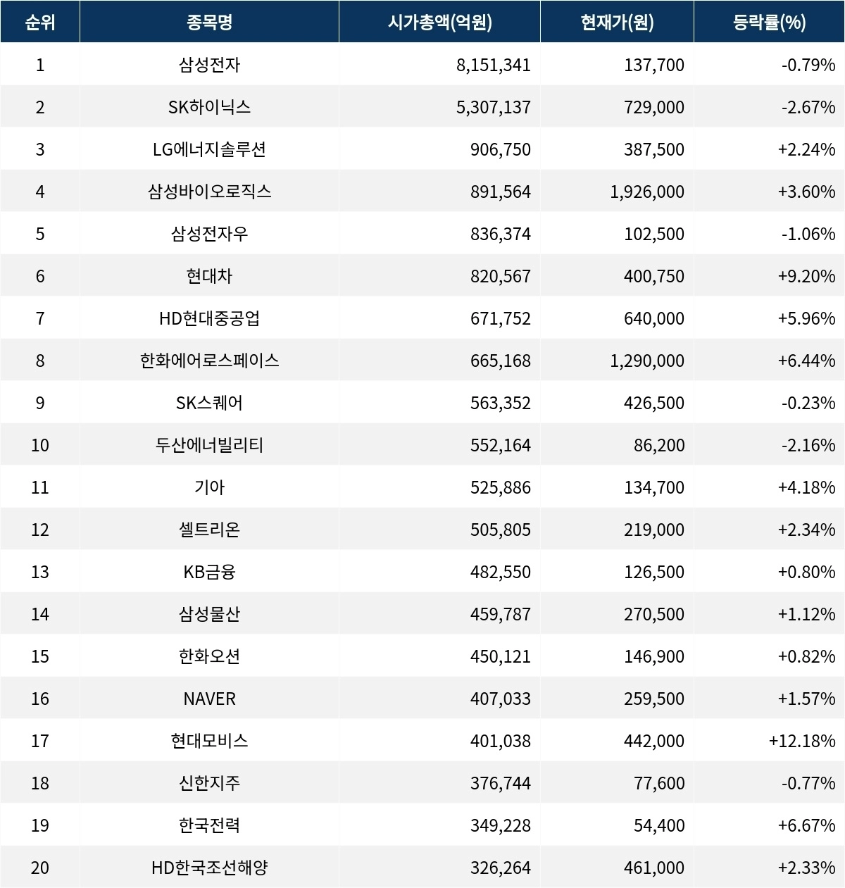 코스피 시가총액 상위 종목들은 상승과 하락이 혼재된 가운데, 특히 현대차와 현대모비스가 두드러진 상승세를 보이고 있다. 외국인 비율과 거래량 지표는 종목별로 차이를 보이며, PER과 ROE를 통해 각 기업의 재무 상태를 가늠할 수 있다.