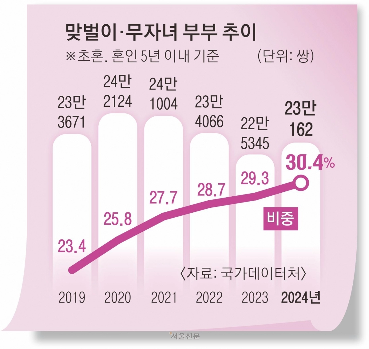 무자녀 부부도 증가 추세다. 결혼 5년 이내 신혼부부(초혼) 중 맞벌이·무자녀 부부의 비율은 2019년 23.4%에서 2024년 30.4%로 5년 만에 7% 포인트나 증가했다. 한국노동연구원이 2024년 발간한 ‘지난 10년간 무자녀 부부의 특성 변화’ 보고서에 따르면 2022년 청년층 맞벌이 기혼 가구 중 무자녀 가정의 비율은 36.3%로 2013년 21.0%에서 무려 14.7% 포인트 늘어났다.