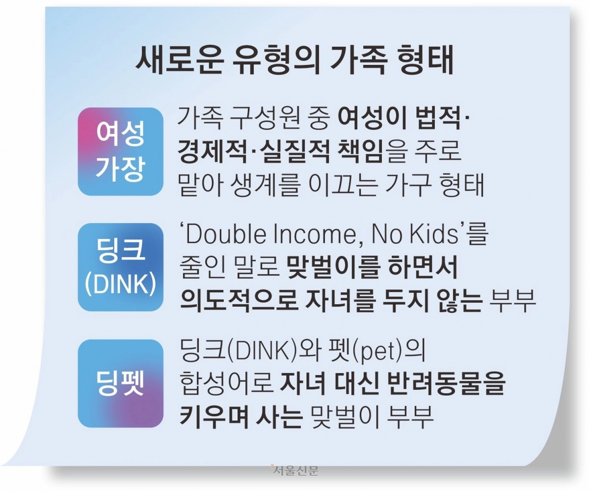 자녀 대신 반려동물 ‘딩펫 부부’도정보기술(IT) 업계에 종사하는 여성가장 김지아(38)씨는 3인 가정의 생계를 책임지고 있다. 대신 프리랜서로 일하는 남편이 전업주부가 되어 가사와 육아를 맡았다. 김씨 부부가 가부장 대신 ‘가모장’ 중심 가정을 택한 배경엔 직장 문제가 있었다. 김씨는 14일 “IT 업계는 급여 수준이 비교적 높고 재택근무가 가능해 제가 일을 유지하는 쪽이 더 이득”이라며 “주변에 남성 외벌이보다 오히려 맞벌이나 여성 외벌이가 더 많다”고 말했다.