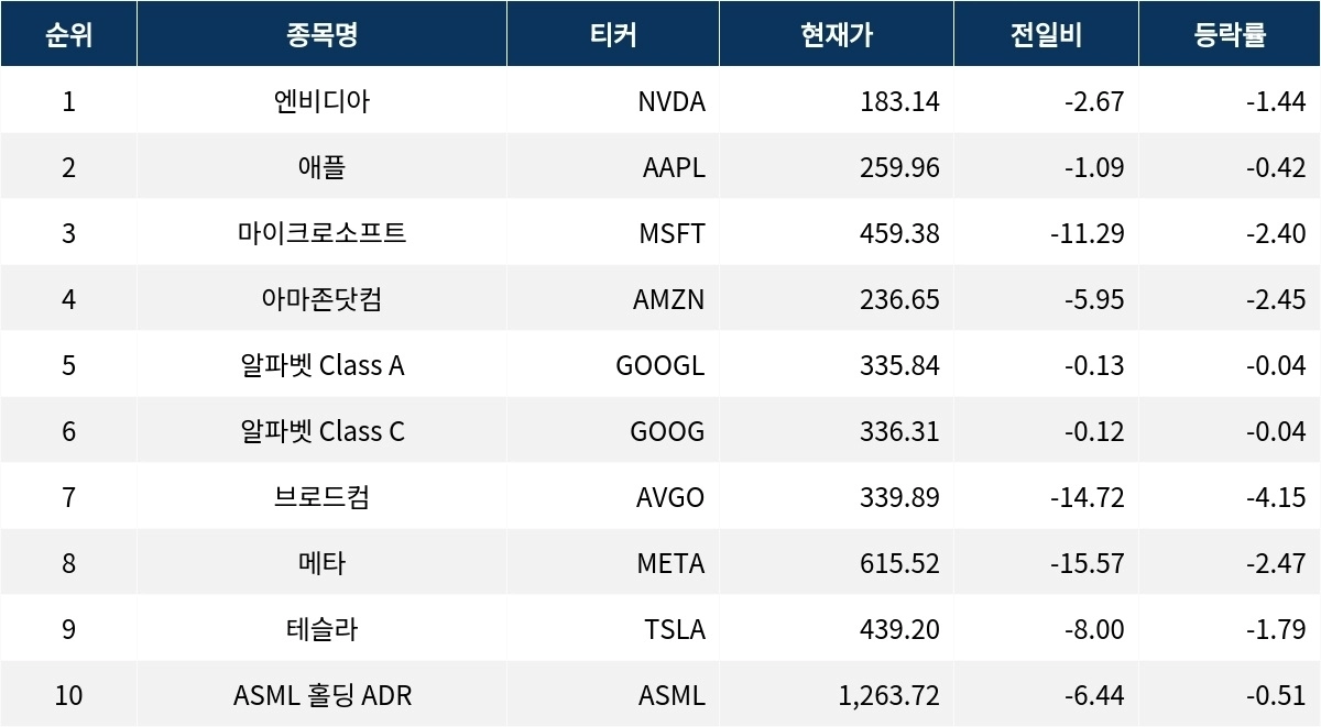 엔비디아(NVDA)는 -1.44% 하락한 183.14달러에 거래를 마쳤다. 마이크로소프트(MSFT)는 -2.40% 하락하여 459.38달러를 기록했다. 브로드컴(AVGO)은 -4.15%로 가장 큰 폭의 하락세를 보이며 339.89달러에 마감했다.