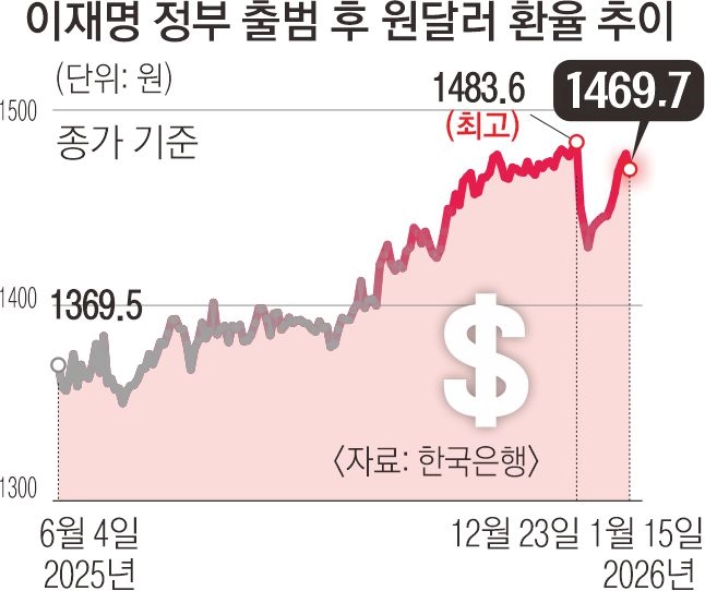 한국은행 금융통화위원회도 이날 새해 첫 통화정책방향 회의에서 ‘고환율’을 이유로 기준금리를 연 2.50%로 5연속 동결했다. 이창용 한국은행 총재는 기자간담회에서 “환율이 중요한 결정 이유였다는 것은 부정할 수 없는 사실”이라며 “환율이 지난 연말 40원 이상 하락했지만 올해 들어 다시 1400원대 중후반 수준으로 높아져 상당한 경계감을 유지해야 한다”고 말했다. 이어 “한국 경제의 펀더멘털이 환율에 영향을 미치지만, 이 외에 수급 요인도 작용하고 있다”고 진단했다.