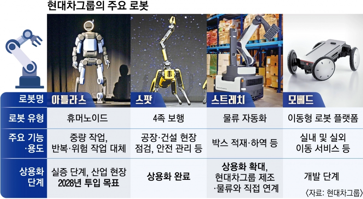 이미 현대차그룹은 로보틱스를 전방에 내세운 피지컬AI 전략을 실행하고 있다. 2028년 산업 현장 투입을 목표로 하는 아틀라스 외에 로봇 자회사인 보스턴다이내믹스의 4족 보행 로봇 ‘스팟’은 미국 조지아주 공장 메타플랜트아메리카(HMGMA) 등에서 안전 점검 업무 등에 투입됐다. 물류 자동화 로봇 ‘스트레치’도 DHL 등 글로벌 기업에서 상용화됐다.