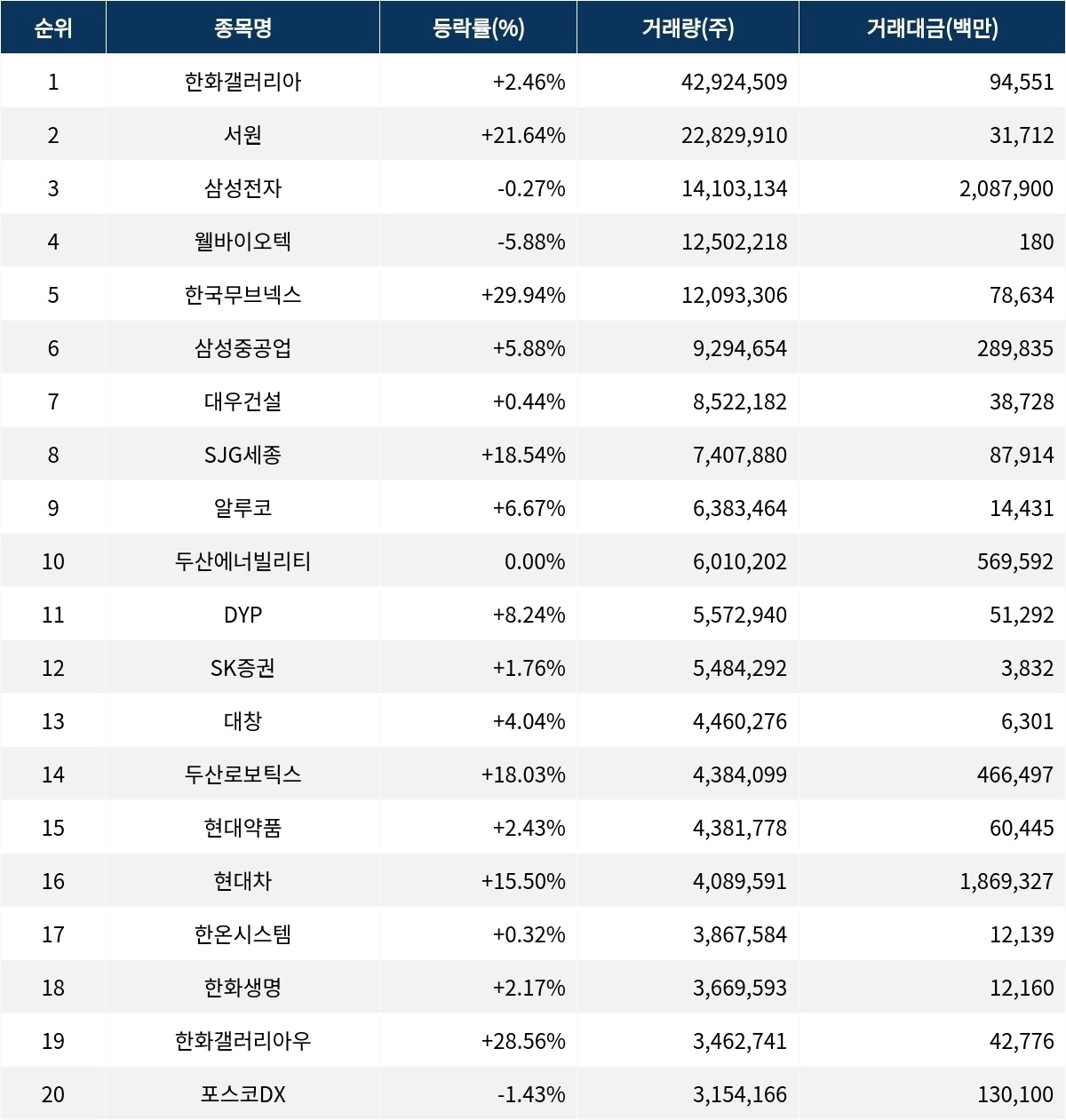 한편 거래량 상위 20위권 종목들은 DYP(092780) ▲8.24%, SK증권(001510) ▲1.76%, 대창(012800) ▲4.04%, 두산로보틱스(454910) ▲18.03%, 현대약품(004310) ▲2.43%, 현대차(005380) ▲15.50%, 한온시스템(018880) ▲0.32%, 한화생명(088350) ▲2.17%, 한화갤러리아우(45226K) ▲28.56%, 포스코DX(022100) ▼1.43% 등의 성적을 기록한다.
