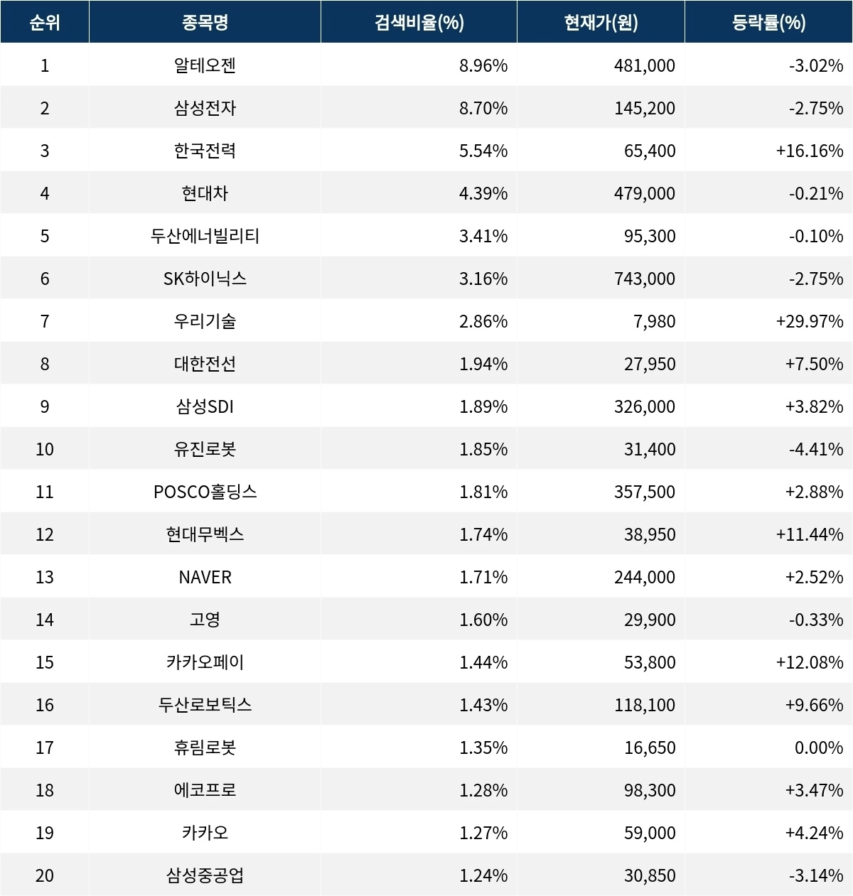 이어 검색비율 2위의 삼성전자(005930)는 등락률 -2.75%로 하락 마감했다. 검색비율 3위의 한국전력(015760)은 16.16% 급등 마감했다. 검색비율 4위 현대차(005380)는 0.21% 하락으로 보합세를 기록했다. 검색비율 5위 두산에너빌리티(034020)는 0.10% 하락하며 보합세로 마감했다.
