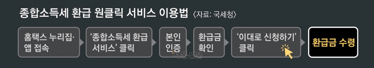 국세청은 국민이 세금을 보다 쉽고 정확하게 돌려받을 수 있도록 ‘종합소득세 환급 원클릭 서비스’ 시스템을 지난해 3월 구축했다. 납세자가 자신의 환급액을 간편하게 확인하고 한 두 번의 클릭만으로 신청까지 마칠 수 있게 한 서비스다.