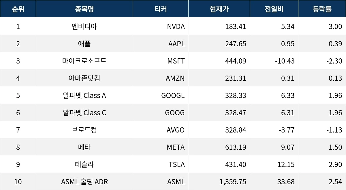 아마존닷컴(AMZN)은 0.13% 상승, 알파벳 Class A(GOOGL)와 알파벳 Class C(GOOG)는 각각 1.96% 상승했다. 브로드컴(AVGO)은 1.13% 하락을 기록했다.