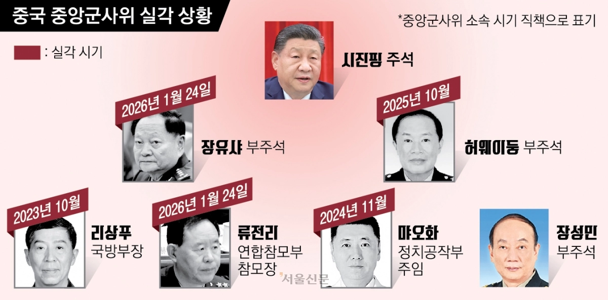 두 사람의 축출로 정원 7명의 중앙군사위에는 시 주석과 지난해 10월 중앙군사위 부주석이 된 장성민만 남게 됐다. 실전 경험이 풍부한 군 지휘부가 낙마하면서 군 현대화 등 전력 강화에는 부담이 될 수 있다는 우려도 제기된다. 뉴욕타임스(NYT)는 “시 주석은 신뢰할 만한 차세대 장성들을 육성하는 데 수년 이상이 걸릴 수 있으며, 중앙군사위 인력 부족 문제도 해결해야 한다”고 짚었다.