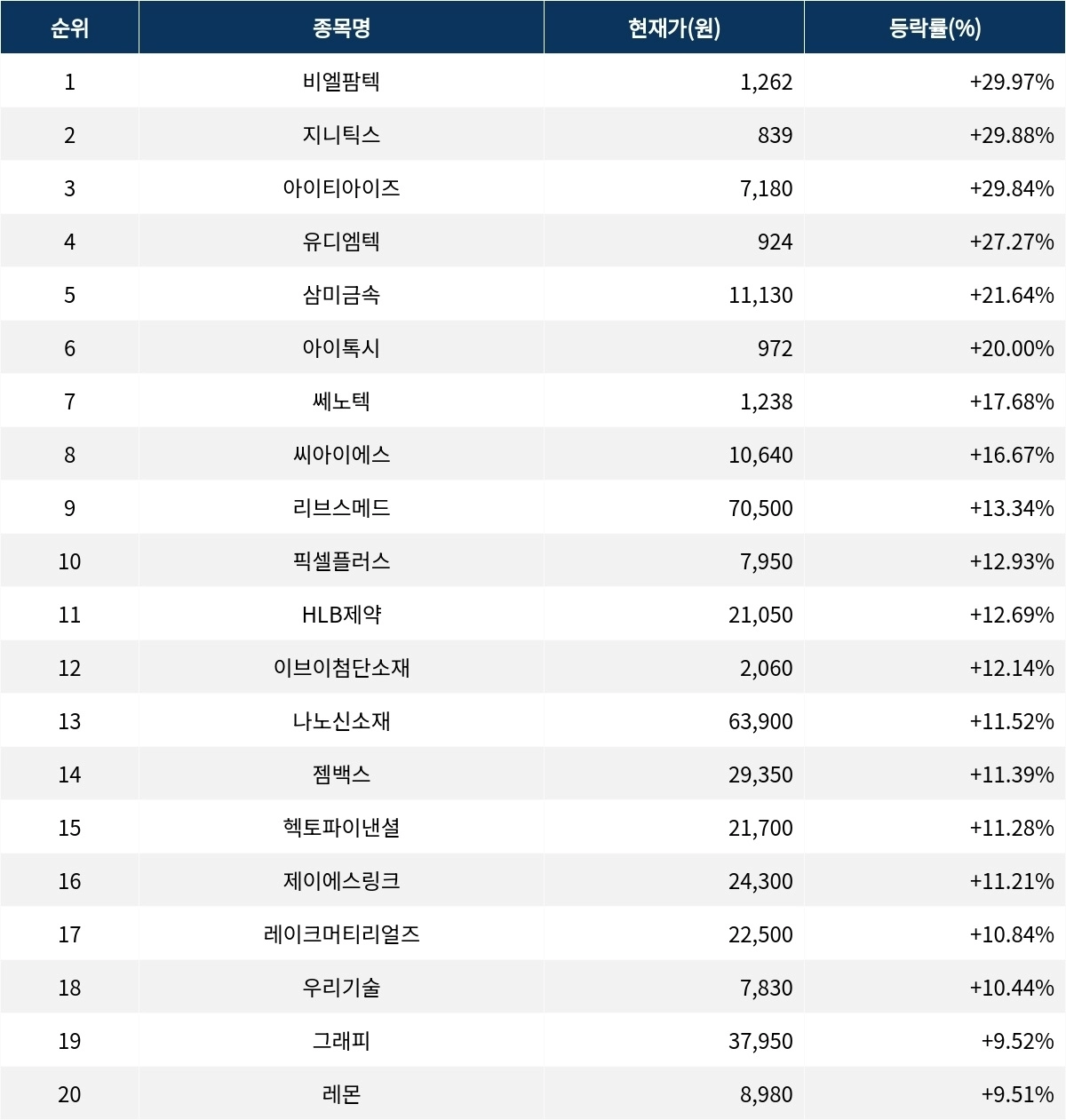 6위 아이톡시(052770)는 현재가 972원으로 20.00% 상승 중이다. 7위 쎄노텍(222420)은 현재가 1238원으로 17.68% 상승 중이다. 8위 씨아이에스(222080)는 현재가 1만 640원으로 16.67% 상승 중이다. 9위 리브스메드(491000)는 현재가 7만 500원으로 13.34% 상승 중이다. 10위 픽셀플러스(087600)는 현재가 7950원으로 12.93% 상승 중이다.