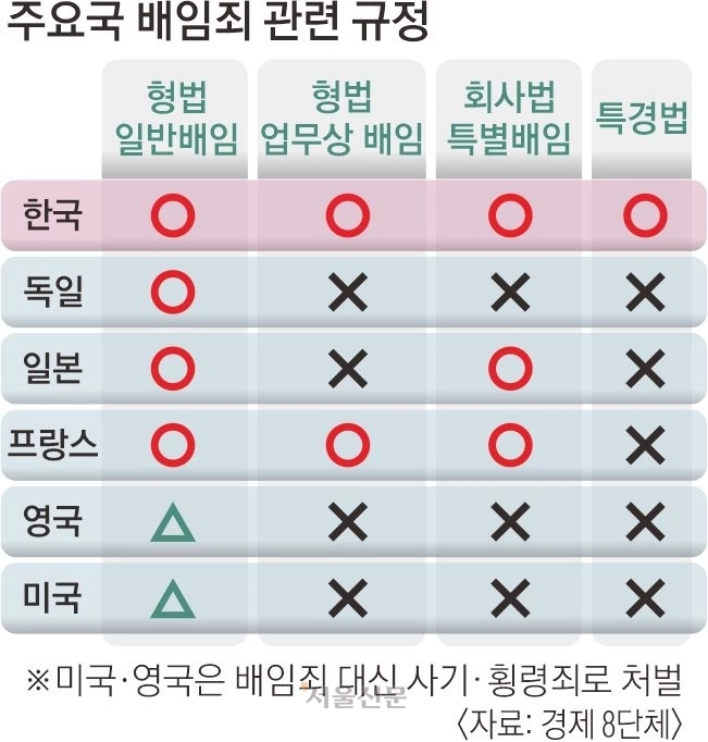 이들은 건의문에서 “국회가 약속했던 배임죄 개선 논의가 지연돼 불확실성이 커지고 있다”며 “우리 경제의 위상에 맞게 배임죄를 전면 개편하고 경영 판단 원칙을 명문화할 것을 촉구한다”고 밝혔다. 이어 “배임죄 개편의 보완책으로 거론되는 징벌적 손해배상, 디스커버리 제도 등은 경영 부담을 오히려 가중시킬 수 있다”고 지적했다. 징벌적 손해배상은 고의적 과실에 가중 처벌을 하는 것이 골자다. 또 디스커버리 제도는 소송 전에 증거를 강제로 공개하는 제도다. 경제8단체는 그 대신 미국이나 영국처럼 사기·횡령죄 또는 민사 절차로 해결하거나 독일·일본처럼 적용 대상과 처벌 행위 등 배임죄 구성요건을 명확히 할 것을 제안했다. 기업인의 합리적인 경영 판단이 실패했다는 이유로 배임 혐의를 씌운다면, 신사업 진출이나 투자 결정이 위축된다는 것이다.