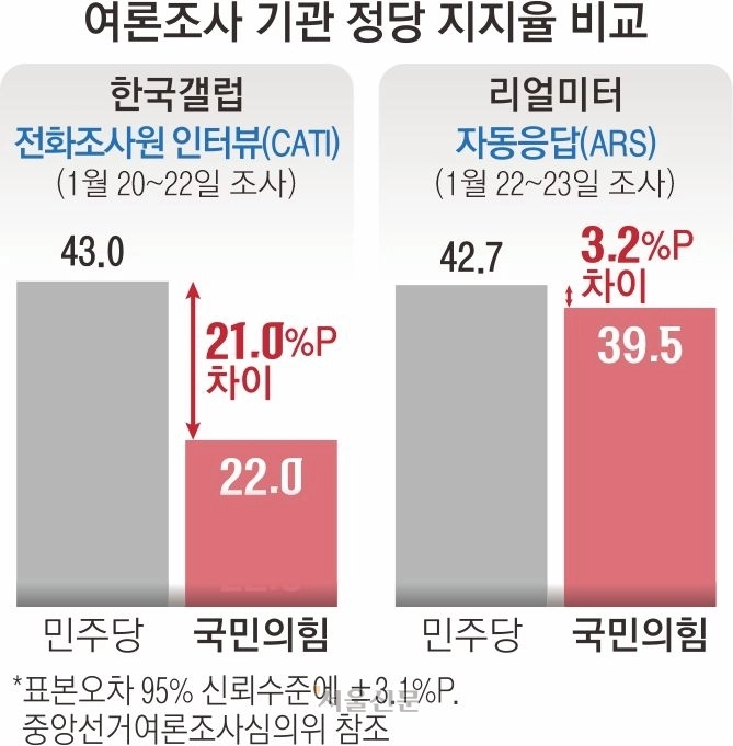 리얼미터가 26일 발표한 정당 지지율 조사(1월 22∼23일, 표본오차 95% 신뢰수준에 ±3.1% 포인트. 중앙선거여론조사심의위 참조)에서 민주당은 42.7%, 국민의힘은 39.5%로 오차 범위 내 접전을 이뤘다. 반면 지난 23일 발표된 한국갤럽(1월 20~22일) 조사에선 민주당(43%) 지지율이 국민의힘(22%)을 21% 포인트 차로 앞서 거의 ‘더블 스코어’를 기록했다. 두 조사에서 민주당 지지율은 비슷하지만 국민의힘 지지율은 상당히 큰 차이를 보였다.