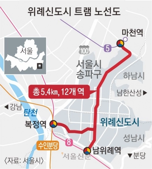 위례선 트램이 다음 달부터 실제 노선에서 본격적인 시운전에 들어간다고 서울시가 26일 밝혔다. 1968년 11월 마지막 전차가 동대문 차고로 들어온 뒤 58년 만에 서울 시내를 노면전차가 달리게 된다. 트램은 지하철 5호선 마천역에서 출발해 복정역(8호선·수인분당선)과 남위례역(8호선)을 연결하며 올해 12월말 정식 개통을 목표로 한다.