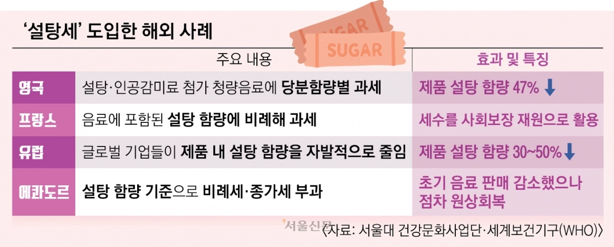 사업단 조사에 따르면, 세계보건기구(WHO) 권고에 따라 이미 전세계 120여개국이 설탕세 또는 그와 유사한 정책을 도입해 시행하고 있다. 대표적으로 영국은 2018년 설탕세를 도입, 설탕 함유량이 높은 청량음료에 세금을 부과하고 있다. 그 결과 과세 대상 청량음료의 설탕 함량이 약 47% 줄었다. 프랑스 역시 음료에 포함된 설탕 함량에 비례해 제품에 세금을 부과하고, 이 세수를 사회보장 재원으로 활용하고 있다.