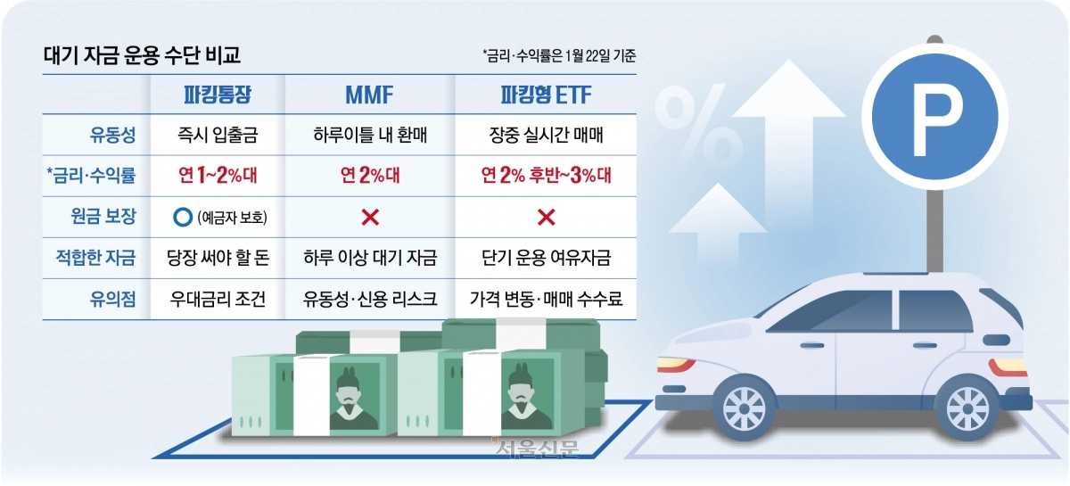연초는 유난히 여윳돈이 늘어나는 시기다. 연말 성과급과 상여금, 연초 인센티브와 배당금이 한꺼번에 유입되기 때문이다. 다만 투자처를 정하기 전까지 자금을 보통예금에 두면 사실상 이자가 거의 붙지 않는다. 이때 활용할 수 있는 대표적인 대기 자금 운용 수단이 파킹통장, 머니마켓펀드(MMF), 파킹형 상장지수펀드(ETF)다. ①언제든 바로 써야 하는 자금이라면 파킹통장이 적합하고 ②하루 이틀의 대기 기간을 감수할 수 있다면 MMF ③장중 가격 변동을 감내할 수 있다면 파킹형 ETF도 선택지가 된다.