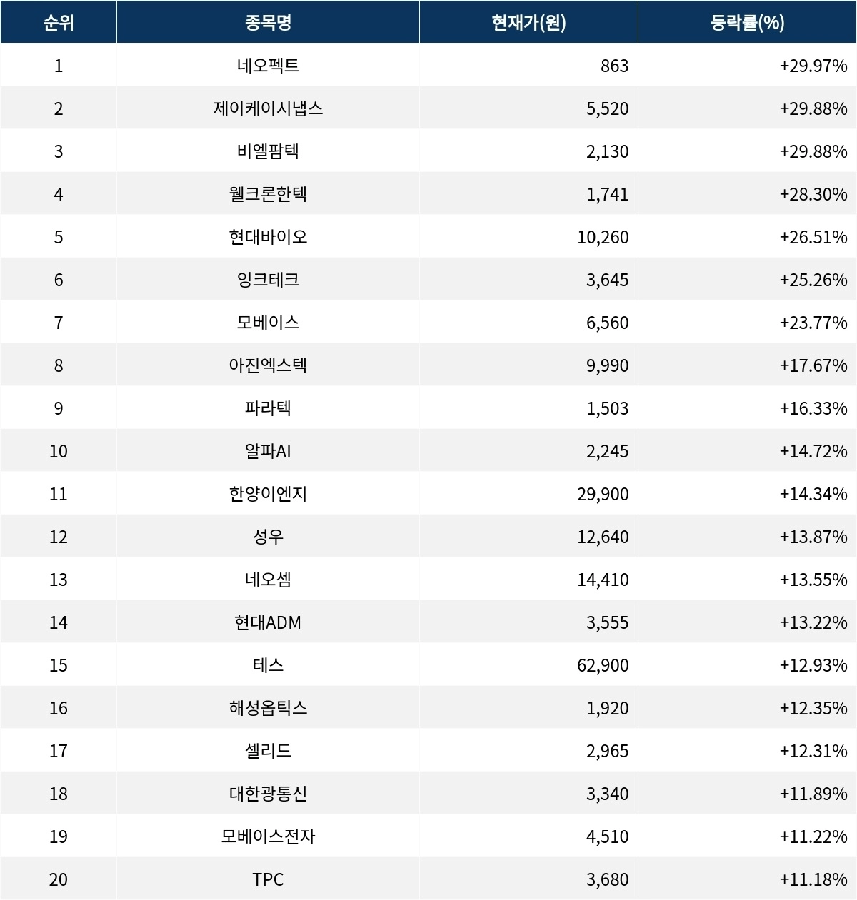이밖에도 한양이엔지(045100) ▲14.34%, 성우(458650) ▲13.87%, 네오셈(253590) ▲13.55%, 현대ADM(187660) ▲13.22%, 테스(095610) ▲12.93%, 해성옵틱스(076610) ▲12.35%, 셀리드(299660) ▲12.31%, 대한광통신(010170) ▲11.89%, 모베이스전자(012860) ▲11.22%, TPC(048770) ▲11.18% 등을 기록하며 시장에서 활발히 거래되고 있다.