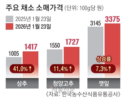 실제 채소 가격은 자영업자 부담을 높이고 있다. 한국농수산식품유통공사(aT)에 따르면 지난 23일 기준 상추(100g) 가격은 1417원으로 전년 대비 41.0% 급등했다. 같은 기간 청양고추와 깻잎 가격도 각각 11.4%, 7.3% 상승했다.