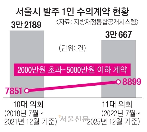 서울신문이 28일, 최근 7년(2019~2025년) 서울시 및 산하기관의 공공사업 계약 현황을 지방재정통합공개시스템을 통해 분석한 결과, 2000만~5000만원 규모의 단독(1개사) 수의계약은 10대 의회(2018년 7월~2021년 12월) 때 7851건에서 11대 의회(2022년 7월~2025년 12월) 들어 8899건으로 급증했다.
