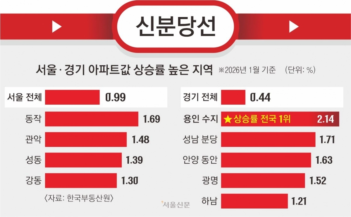 29일 한국부동산원에 따르면 수지는 지난해 10·15 대책 발표 이후 아파트 가격이 가장 많이 오른 지역이다. 지난해 11월 첫째 주부터 1월 넷째 주까지 누적으로 5.55%가 뛰었다. 1기 신도시 재건축 호재 등으로 집값이 크게 오른 분당(5.17%) 보다 높은 상승률이다. 수지의 상승률은 올해 들어서도 2.14%로 전국에서 가장 높았다. 지난해 이맘때 0.04% 오른 것과 비교하면 상전벽해다.