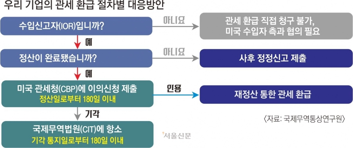 정산 전이라면 정정신청을 통해 기존에 수입 신고했던 내역을 간단히 수정만 하면 되는 ‘PSC(사후정정)’라는 간단한 절차로 환급받을 수 있다. 미리 준비한 기업만이 빠르고 쉽게 환급을 받을 수 있다는 의미다. 한아름 무역협회 국제무역통상연구원 수석연구원은 “판결이 나면 즉시 해당되는 건에 대해 수정 신고를 할 수 있도록 미리 대비를 해야 한다”고 말했다. 반면 정산이 끝난 후에는 미국 관세청을 상대로 한 ‘Protest(이의제기)’ 절차가 필요하다. 이의제기가 기각되면 미국의 국제무역법원에 항소 절차까지 밟아야 하는데, 이 과정이 복잡하고 시간이 오래 걸리는 데다 비용 문제까지 더해져 특히 중소·중견기업에 더 불리하다.