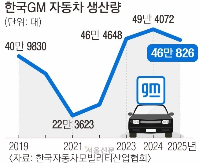 하지만 지난해 1년간 한국GM이 국내에서 판매한 완성차는 1만 5094대에 불과해 2024년보다 39.2% 급감했고, 내수 시장 점유율도 0.9%였다. 또 전체 판매량 중 내수 비중은 3.3%에 불과하다. 사실상 미국 본사를 위한 위탁 생산 기지라는 평가도 나온다.