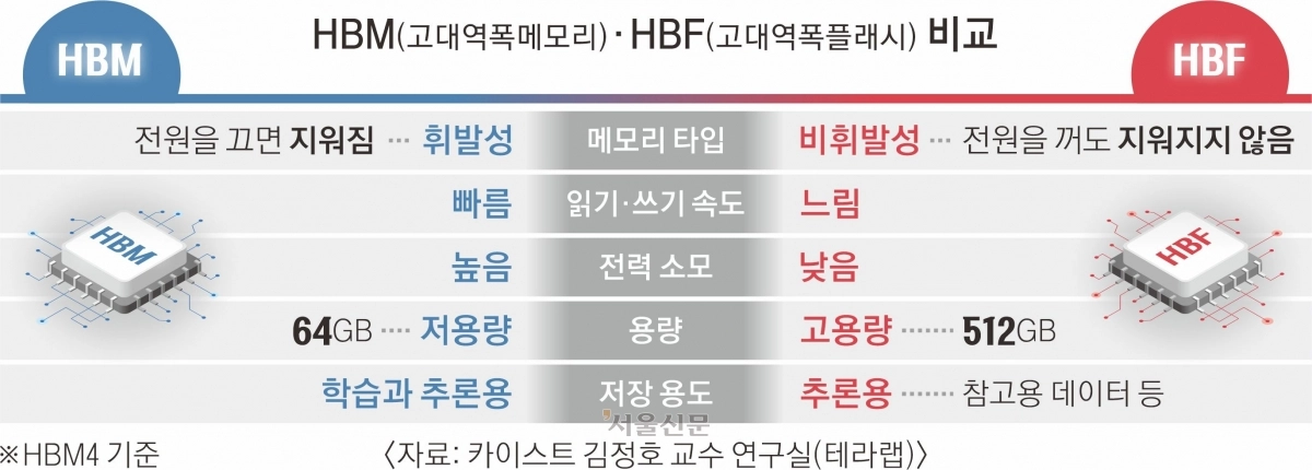 양사의 움직임도 분주하다. SK하이닉스는 샌디스크와 협력해 내년 양산을 목표로 HBF를 개발하고 있다. SK하이닉스는 지난달 29일 실적 콘퍼런스콜에서 “HBM의 확장 개념인 HBF 기술을 구체화하는 등 다양하고 변화하는 AI 시장에 입체적으로 대응하려고 한다”고 밝혔다. 삼성전자는 현재 HBM에 주력하고 있지만, 내부적으로 HBF 독자 개발을 진행하는 것으로 알려졌다.
