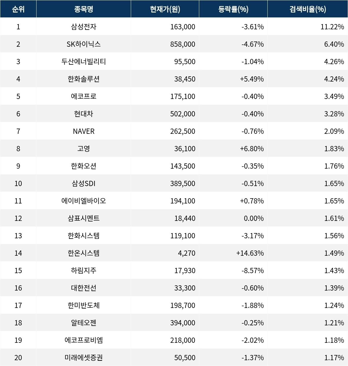 이어 SK하이닉스(000660)가 검색비율 2위를 기록하며 4.67%의 하락세를 보이고 있다. 검색비율 3위의 두산에너빌리티(034020)는 1.04% 하락하며 출발했다. 검색비율 4위 한화솔루션(009830)은 개장 초반부터 5.49% 상승하며 상승세를 보이고 있다. 검색비율 5위 에코프로(086520)는 0.40% 하락하며 큰 움직임을 보이지 않고 있다.
