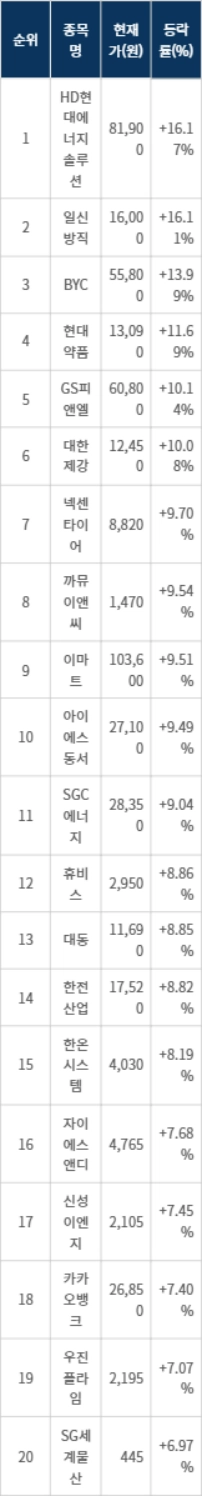 6위 대한제강(084010)은 종가 12,450원으로 10.08% 상승 마감했다. 7위 넥센타이어(002350)는 종가 8,820원으로 9.70% 상승 마감했다. 8위 까뮤이앤씨(013700)는 종가 1,470원으로 9.54% 상승 마감했다. 9위 이마트(139480)는 종가 103,600원으로 9.51% 상승 마감했다. 10위 아이에스동서(010780)는 종가 27,100원으로 9.49% 상승 마감했다.