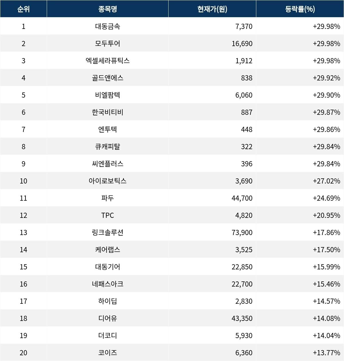 6위 한국비티비(219750)는 종가 887원으로 29.87% 상승 마감했다. 7위 엔투텍(227950)은 종가 448원으로 29.86% 상승 마감했다. 8위 큐캐피탈(016600)은 종가 322원으로 29.84% 상승 마감했다. 9위 씨엔플러스(115530)는 종가 396원으로 29.84% 상승 마감했다. 10위 아이로보틱스(066430)는 종가 3,690원으로 27.02% 상승 마감했다.