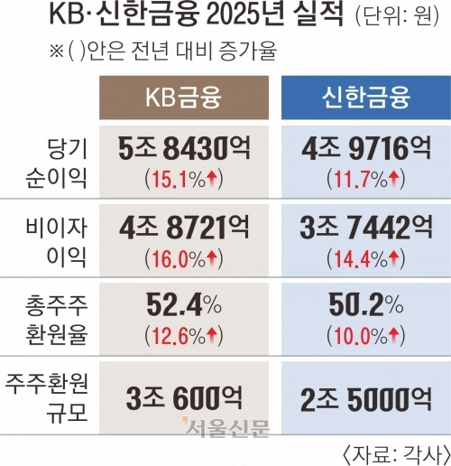 5일 각 사 공시에 따르면 KB금융의 2025년 연결 기준 당기순이익은 5조 8430억원으로 전년 대비 15.1% 증가했다. 신한금융도 같은 기간 4조 9716억원의 순이익을 기록해 전년보다 11.7% 늘었다. 연간 순이익 기준으로는 KB금융이 신한금융을 8714억원 앞서며 2년 연속 ‘리딩금융’ 자리를 지켰다.