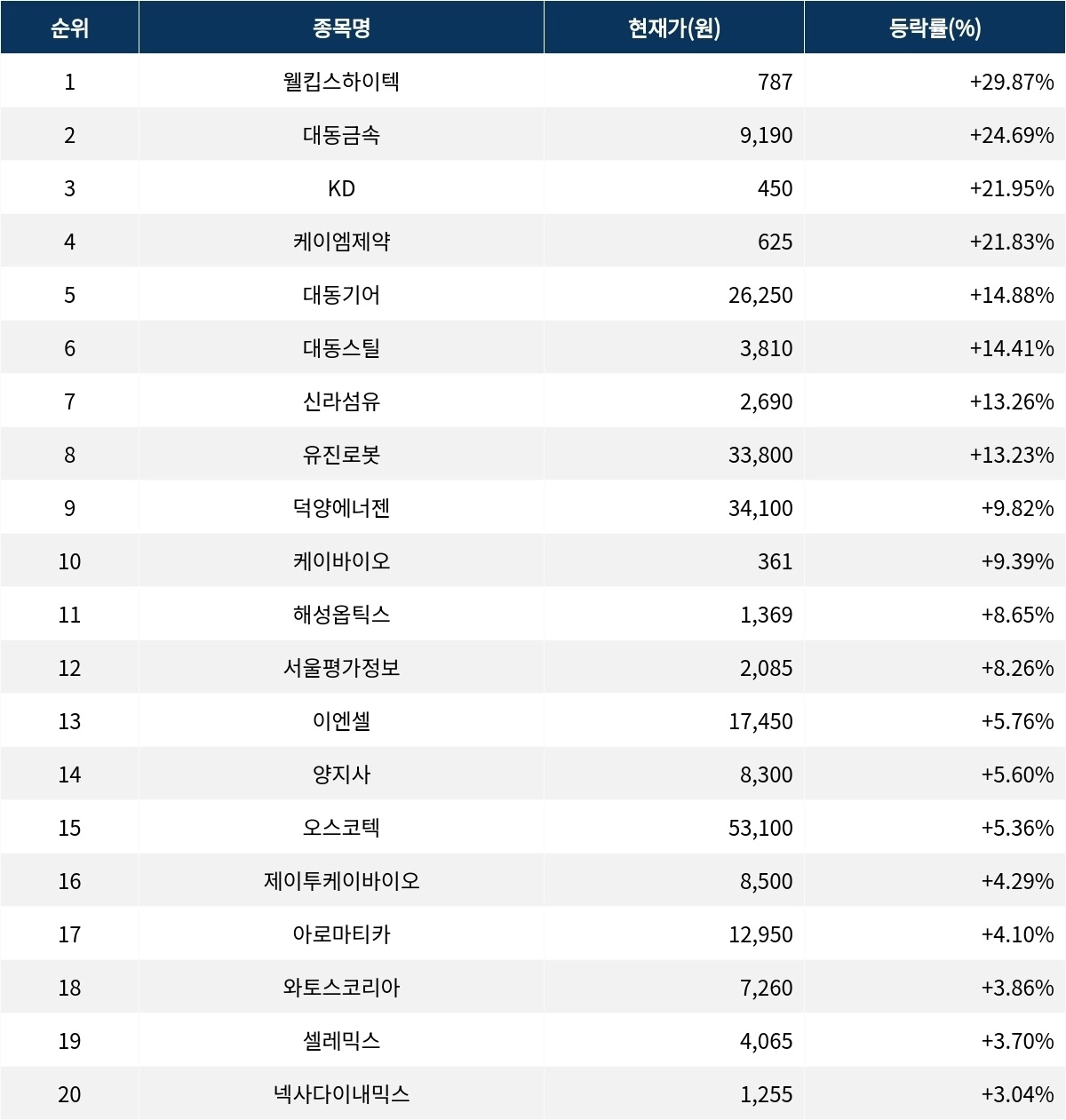 6위 대동스틸(048470)은 현재가 3810원으로 14.41% 상승 중이다. 7위 신라섬유(001000)는 현재가 2690원으로 13.26% 상승 중이다. 8위 유진로봇(056080)은 현재가 3만 3800원으로 13.23% 상승 중이다. 9위 덕양에너젠(0001A0)은 현재가 3만 4100원으로 9.82% 상승 중이다. 10위 케이바이오(038530)는 현재가 361원으로 9.39% 상승 중이다.