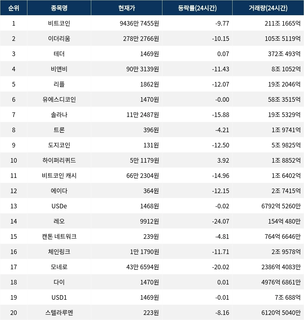 글로벌 가상자산 시황 중계 사이트 코인마켓캡(CoinMarketCap)에 따르면, 비트코인은 현재 9436만 7455원에 거래되고 있으며, 시가총액은 1885조 9315억 원이다. 24시간 등락률은 -9.77%로 하락세를 보이고 있으며, 1시간 등락률은 -1.07%로 단기적으로 하락세가 지속될 가능성이 있다. 거래량은 211조 1665억 원에 달한다.